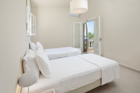 Bedroom with twin beds (king-size upon request), which opens to a small balcony overlooking the sea